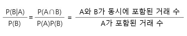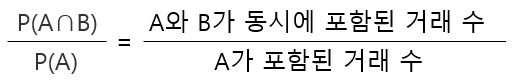 ex) A를 빵, B를 우유라고 하면 빵 -> 버터의 신뢰도 = ( 빵과 버터를 동시에 구매한 거래 수 ) / ( 빵이 포함된 전체 거래 수 )