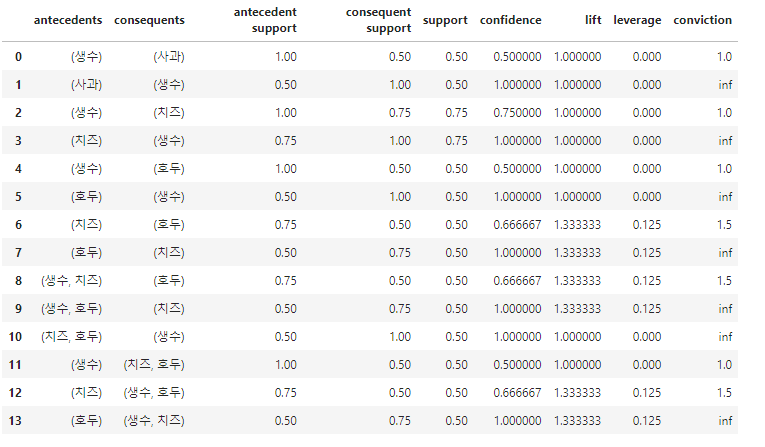 - association_rules 함수를 이용하여 지지도가 0.5가 넘는 항목에 대해 향상도가 양의 상관관계에 있는 것이 무엇인지 알 수 있습니다.